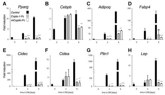 Inhibitory traps suppress expression of adipocyte marker genes. (A–H) Induction of adipocyte marker gene expression was analyzed by qRT- PCR on days 0, 3 and 8 of differentiation in control, mCryptic-Fc, and Cripto-1-Fc treated cells (black, grey and white bars, respectively). RNA isolation and qRT-PCR analysis were performed as described [42]. Data was normalized to Rpl4 mRNA and is shown as fold induction relative to day 0 levels. Statistical significance from two biological replicates was determined by two-way ANOVA and Sidaki’s post-hoc tests (* p < 0.05; ** p < 0.01; *** p < 0.001; **** p < 0.0001) using Prism 9. Expression of adipogenic transcription factors (A) Pparg, and (B) Cebpb. Expression of adipocyte marker genes (C) Adipoq, (D) Fabp4, and (E) Lep. Expression of genes associated with lipid droplet formation (F) Cidec, (G) Cidea, and (H) Plin1.