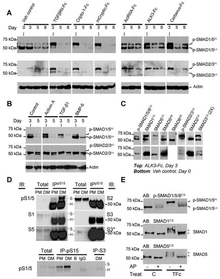 As SMADs have multiple phosphorylation sites in addition to their C-terminal Serines (Figure S8), and as SMAD linker- or hyper-phosphorylation has been widely reported to regulate signaling activities [62,63,64,65,66,67], we hypothesized p-SMAD1/5Hi could represent a hyper-phosphorylated form. To test this hypothesis, we treated lysates of control and TGFβRII-Fc treated samples with alkaline phosphatase (AP) and evaluated changes in SMAD1/5 electrophoretic mobility using different antibodies (Figure 5E). AP treated samples were largely undetectable by the p-SMAD1/5/8 antibody due to near complete loss of all phosphate groups. By contrast, SMAD1 and SMAD5 antibodies reacted well with both untreated and AP treated samples. We saw a small difference in electrophoretic mobility in control samples following AP digestion and mainly detected a band that corresponded to p-SMAD1/5Lo. Strikingly, the band corresponding to p-SMAD1/5Hi in TGFβRII-Fc (TFc) treated samples was reduced by AP treatment to an electrophoretic mobility that corresponded to p-SMAD1/5Lo. These results indicate that p-SMAD1/5Hi could represent a hyper-phosphorylated SMAD1/5. However, we cannot entirely rule out other SMAD/1/5 post-translational modifications or antibody cross-reactivity with p-SMAD2/3.