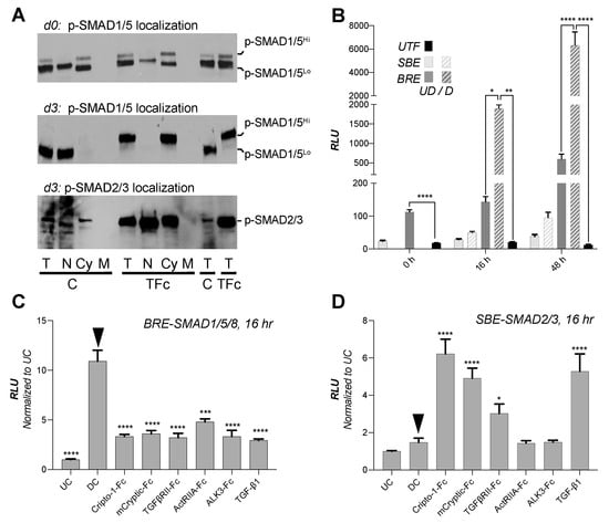 Hyper-phosphorylated SMADs are known to exhibit altered cellular localization and signaling [62,63,64,65]. To establish how the different p-SMAD forms and treatments affect cellular localization, we separated cell extracts into nuclear, cytoplasmic and membrane fractions and probed these with anti-p-SMAD antibodies (Figure 6A). Untreated control cells presented both p-SMAD1/5 forms at the beginning of differentiation (d0) and mainly exhibited nuclear pSMAD1/5Lo during differentiation (d3). By contrast, cells treated with TGFβRII-Fc mainly exhibited cytoplasmic p-SMAD1/5Hi during differentiation (d3). These findings suggest that SMAD1/5Lo can translocate to the nucleus, whereas p-SMAD1/5Hi remains cytoplasmic. We did not observe differences in p-SMAD2/3 localization between control and inhibitor-treated samples but found that p-SMAD2/3 levels increased significantly in inhibitor-treated samples.
