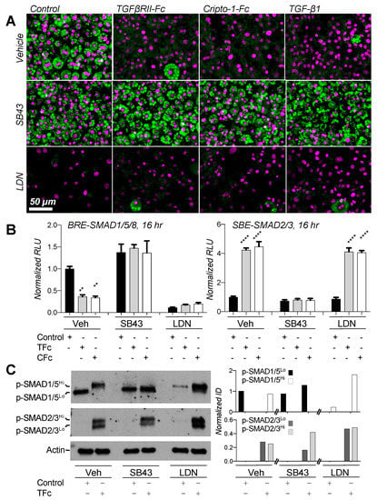 To link SB43 and LDN treatment with SMAD signaling in 3T3-L1 differentiation, we used luciferase reporters. As we found earlier (Figure 6C,D), SMAD2/3 signaling was increased and SMAD1/5/8 signaling was suppressed by TGFβRII-Fc and Cripto-1-Fc (Figure 7B). As expected, SB43 blunted SMAD2/3 signaling in cells treated with inhibitor traps. SB43 also rescued SMAD1/5/8 signaling, indicating that SMAD2/3 activation, SB43, or the SB43 target kinases ALK4, ALK5 or ALK7 may regulate SMAD1/5/8 activities in these cells. In contrast to SB43, LDN suppressed SMAD1/5/8 signaling as expected but had no effect on SMAD2/3 signaling. Strikingly, SB43 did not rescue adipogenesis in LDN treated cells (Figure S10), indicating that SMAD2/3 independent inhibition of SMAD1/5/8 signaling is sufficient to arrest adipogenesis.