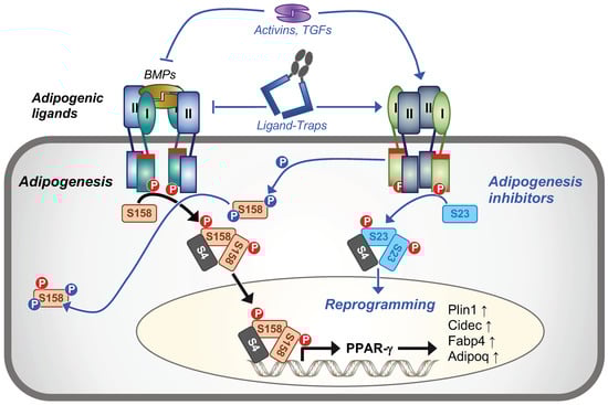 SMAD signaling and regulation in adipogenesis. Black arrows represent the proposed pathway of BMP/TGF-β signaling that leads to adipogenesis. BMPs and the type I receptor kinases, including ALK2, and ALK3 (Figures S1 and S8) activate SMAD1/5/8 signaling (orange rectangles labeled S158) by C-terminal phosphorylation (red circled P). Activated SMAD1/5/8 form a trimeric complex with SMAD4 (grey rectangles labeled S4), which translocates to the nucleus to directly or indirectly regulate expression of adipogenic genes, including Pparg, Plin1, Cidec, Fabp4 and Adipoq. SMAD2/3 signaling (light blue rectangles labeled S23) is inactive in adipogenesis. Blue arrows represent the proposed pathway of BMP/TGF-β signaling in adipogenesis arrest. Differentiating 3T3-L1 cells treated with anti-adipogenic traps and ligands show both SMAD2/3 activation and SMAD1/5/8 inhibition. SMAD2/3 activating kinases or SMAD2/3 regulated genes could negatively regulate SMAD1/5/8 signaling by inducing its hyperphosphorylation (blue circled P), which may lead to reduced SMAD1/5/8 nuclear translocation and transcriptional activity.