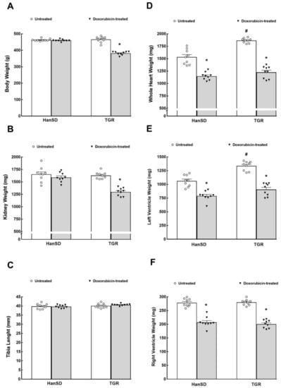As shown in Figure 1A, DOX treatment did not significantly decrease body weight in HanSD rats but did so in TGR. DOX treatment did not cause any change in kidney weight in HanSD rats but decreased it significantly in TGR (Figure 1B). As shown in Figure 1D,E, untreated TGR revealed significantly higher whole heart and LV weights as compared with untreated HanSD rats, but there were no significant differences in right ventricle (RV) weights between them (Figure 1F). DOX treatment caused significant decreases in the whole heart weight, LV and RV weights in HanSD rats, and TGR as compared with weights in counterparts without DOX administration. DOX treatment elicited significantly greater decreases in whole and LV weights in TGR as compared with HanSD rats (−34.3 ± 0.4 vs. −25.1 ± 0.5% and −32.3 ± 0.5 vs. −25.7 ± 0.3%, respectively, p < 0.05 in both cases), but caused similar decreases in RV weights. On the other hand, DOX administration did not result in any alteration in tibia length in any group (Figure 1C), indicating that the reduced body weights, kidney, and heart weights are not a consequence of general growth retardation.