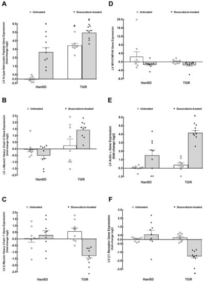 The first part of left ventricle (LV) mRNA expression. LV natriuretic peptide type A (A), α-myosin heavy chain isoform 6 (MYH6) (B), β-myosin heavy chain isoform 7 (MYH7) (C), ratio MYH7/MYH6 (D), α actin (E), β1 adrenergic receptors (F) gene expression in untreated and doxorubicin-treated normotensive, transgene-negative Hannover Sprague–Dawley (HanSD) and hypertensive, Ren-2 transgenic (TGR) rats. * p < 0.05 compared with untreated animals of the same strain. # p < 0.05 versus HanSD rats within the same protocol. Statistical comparison was made by one-way ANOVA analysis.