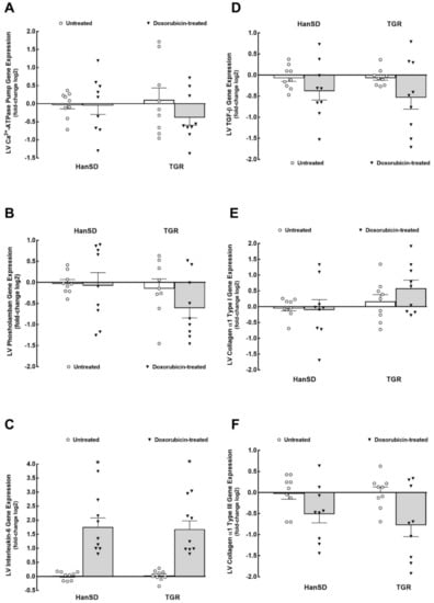 As shown in Figure 3A, there were no significant differences in the ATPase, Ca2+, cardiac muscle, slow twitch, type 2 gene expression in the LV (a gene that encodes the sarco/endoplasmatic reticulum Ca2+-ATPase—so-called SERCA) between untreated HanSD rats and untreated TGR and DOX treatment did not modify them in either group. Likewise, there were no significant differences in the phospholamban gene expression in the LV between untreated HanSD rats and untreated TGR, and DOX treatment did not alter them (Figure 3B). As shown in Figure 3C, there were no significant differences in the interleukin-6 gene expression in the LV between untreated HanSD rats and untreated TGR, and DOX treatment caused similar significant increases in HanSD rats as well as TGR. There were no significant differences in transforming growth factor beta (TGF-β), collagen α1 type I, and collagen α1 type III gene expression in LV between untreated HanSD rats and untreated TGR and DOX treatment did not alter it in either strain (Figure 3D–F).