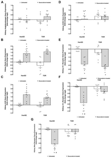 Figure 4, Figure 5 and Figure 6 summarize the effects of DOX treatment on kidney mRNA expression. As shown in Figure 4A, they were no significant differences between untreated HanSD rats and untreated TGR in angiotensinogen gene expression, and DOX treatment did not alter it significantly in either group. There were no significant differences between untreated HanSD rats and untreated TGR in renin gene expression, and DOX treatment significantly increased it, both in HanSD and TGR (Figure 4B). As shown in Figure 4C, angiotensin-converting enzyme (ACE) kidney mRNA expression showed a pattern similar to that for renin gene expression. There were no significant differences between untreated HanSD rats and TGR, and DOX treatment similarly increased it in either strain. There were no significant differences between untreated HanSD rats and untreated TGR in kidney angiotensin-converting enzyme type 2 (ACE2) mRNA expression and DOX treatment did not change these values in either group (Figure 4D). As shown in Figure 4E, there were no significant differences between untreated HanSD rats and untreated TGR in kidney mRNA expression of ANG II type 1 (AT1) receptor, and DOX treatment caused pronounced and similar decreases in this value, similar in either strain. As shown in Figure 4F, there were no significant differences between untreated HanSD rats and untreated TGR in kidney mRNA expression of ANG II type 2 (AT2) receptor, and DOX treatment significantly decreased it in HanSD rats, but not in TGR. Mas kidney mRNA expression showed a pattern similar to that of AT2 receptor gene expression: there were no significant differences between untreated HanSD rats and untreated TGR, and DOX treatment caused a profound decrease in this value in HanSD rats but not in TGR (Figure 4G).