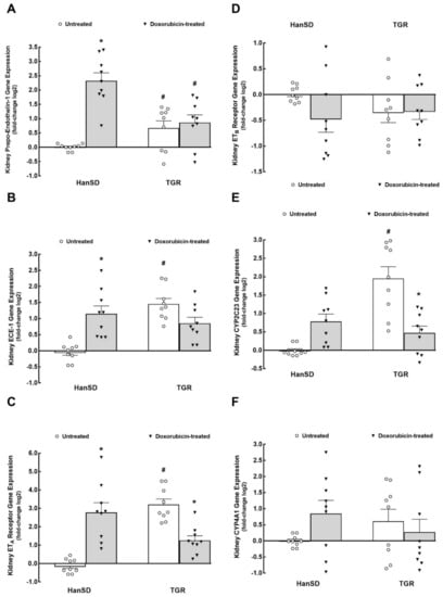 The second part of kidney mRNA expression. Kidney prepro-Endothelin-1 (A), endothelin-converting enzyme type 1 (ECE-1) (B), endothelin type A (ETA) receptor (C), endothelin type B (ETB) receptor (D), cytochrome P-450 subfamily 2C23 (CYP2C23) (E) and cytochrome P-450 subfamily 4A1 (CYP4A1) (F) gene expression in untreated and doxorubicin-treated normotensive, transgene-negative Hannover Sprague–Dawley (HanSD) and hypertensive, Ren-2 transgenic (TGR) rats. * p < 0.05 compared with untreated animals of the same strain. # p < 0.05 versus HanSD rats within the same protocol. The values are means ± SEM. Statistical comparison was made by one-way ANOVA analysis.