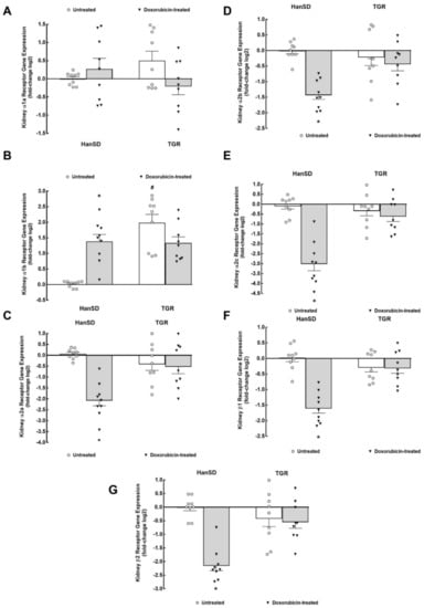 The third part of kidney mRNA expression. Kidney α1 subtype a (α1a) adrenergic receptor (A), α1 subtype b (α1b) adrenergic receptor (B), α2 subtype a (α2a) adrenergic receptor (C), α2 subtype b (α2b) adrenergic receptor (D), α2 subtype c (α2c) adrenergic receptor (E), β adrenergic receptor type 1 (β1) (F) and β adrenergic receptor type 2 (β2) (G) gene expression in untreated and doxorubicin-treated normotensive, transgene-negative Hannover Sprague–Dawley (HanSD) and hypertensive, Ren-2 transgenic (TGR) rats. * p < 0.05 compared with untreated animals of the same strain. # p < 0.05 versus HanSD rats within the same protocol. The values are means ± SEM. Statistical comparison was made by one-way ANOVA analysis.