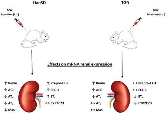 Graphical summary of the most important effects of doxorubicin (DOX) treatment on the intrarenal messenger ribonucleic acid (mRNA) expressions of vasoactive systems implicated in the pathophysiology of heart failure-associated cardiorenal syndrome in normotensive, transgene-negative Hannover Sprague–Dawley (HanSD) rats and hypertensive, Ren-2 transgenic (TGR) rats. Specifically, renin, angiotensin-converting enzyme (ACE), angiotensin II type 1 (AT1) receptor, angiotensin II type 2 (AT2) receptor, Mas receptor (Mas), prepro-endothelin-1 (Prepro-ET-1), endothelin-converting enzyme type 1 (ECE-1), endothelin type A (ETA) receptor and cytochrome P-450 subfamily 2C23 (CYP2C23). (↓) indicates downregulation, (↑) indicates upregulation, (↔) indicates no significant change.