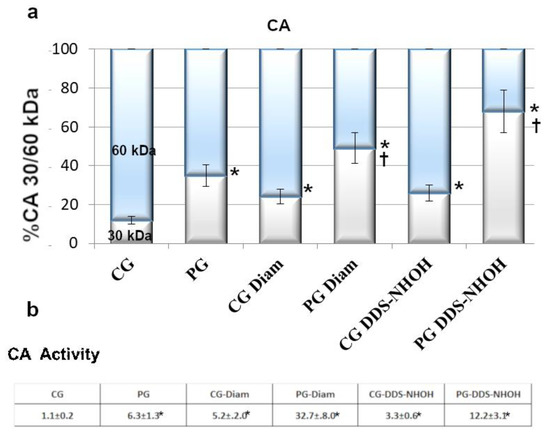 Cytosolic compartments of PG RBC showed much higher monomeric CAII isoform (30 kDa) than CG RBC (35 ± 3.7% compared to 12 ± 3%, respectively, p < 0.001). Being the activity of CA strictly depending on its monomerization [36], a CA activity assay was performed, with PG RBC exhibiting almost six times higher values compared to CG RBC (Figure 1). When RBCs were treated with diamide, the amount of the 30 kDa band of CA increased to 24% and 49%, in CG and PG RBC, respectively, (p < 0.001), with a parallel activity increase (5.2 ± 2 in CG and 32.7 ± 8.0 in PG, p < 0.001). In addition, in the presence of DDS-NHOH, if the process of formation of the 30 kDa isoform was more evident (26% in CG, 68% in PG), the correspondent values of CA activity were not so drastically increased as expected (3.3 ± 0.6 and 12.2 ± 3.1 in CG and PG, respectively).