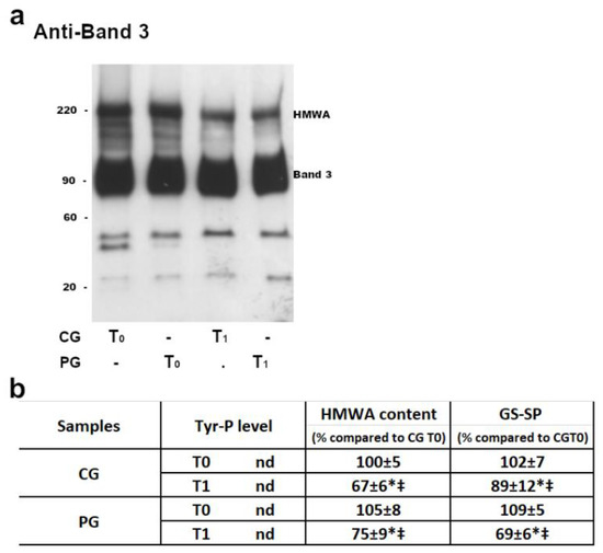 In both CG and PG, RBC membranes at T0 (before licorice intake) showed a similar pattern of B3 Tyr-P levels (which remained practically undetectable) and HMWA content (Figure 2, panel b).