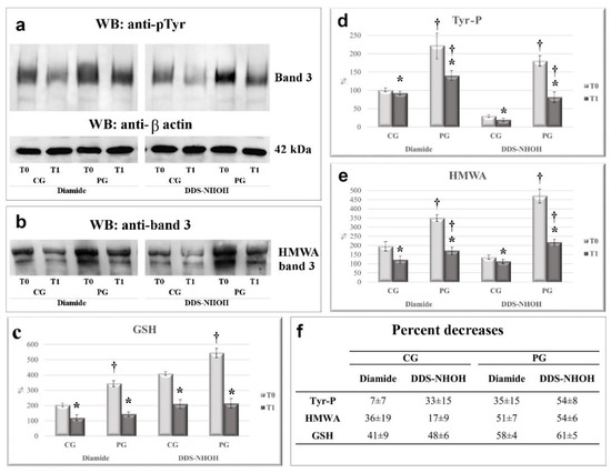 The effect of 1-week licorice intake on the Tyr-P level (a), HMWA, (b) and membrane GSH contents (c), following diamide or DDS-NHOH stimulation, in the CG and PG groups. RBCs from CG and PG were incubated with 1.5 mM diamide or 0.30 mM DDS-NHOH. The membranes (10 µg) obtained, as described in Methods, were analyzed by Western blotting and immunostained with the anti-P-Tyr antibody and then with anti-β actin as a loading control (Panel a). The membranes were also analyzed in non-reducing conditions and immunostained with anti-band 3 (Panel b) or anti-GSH (not shown) antibodies, in order to evidence the band 3 high molecular weight aggregate (HMWA) and bound glutathione, respectively. The figure is representative of the study population. For each immunostaining, bands corresponding to the relative proteins were densitometrically estimated and statistically analyzed GSH values of diamide or DDS-NHOH treated RBCs were calculated as the ratio percentage to GSH levels obtained in the basal samples of CG at T0 (chosen as an arbitrary comparison unit, experimentally determined as 101 ± 3%) (Panel c). The Tyr-P value of diamide—or DDS-NHOH—treated RBCs before (T0) and after a week of licorice intake (T1) was calculated as: Tyr-P% = (Tyr-P(x)/Tyr-P(CG) diamide T0%, with the Tyr-P value obtained in diamide samples of CG at T0 chosen as an arbitrary comparison unit (experimentally determined as 100 ± 5%) (Panel d). The band 3 HMWA of diamide or DDS-NHOH treated RBCs were calculated as the ratio percentage to band 3 HMWA obtained in the basal samples of CG at T0 (chosen as an arbitrary comparison unit, experimentally determined as 100 ± 4 and) (Panel e). (Panel f) average percent decrease for each parameter, referring to the corresponding values at T0, were calculated and reported. Data show the means ± SD of n = 12 healthy subjects (CG) and n = 18 patients (PG). Comparison from the respective T0 values: * p < 0.005, Student’s t-test for paired data. Comparison CG vs PG: † p < 0.001, Student t-test for unpaired data.