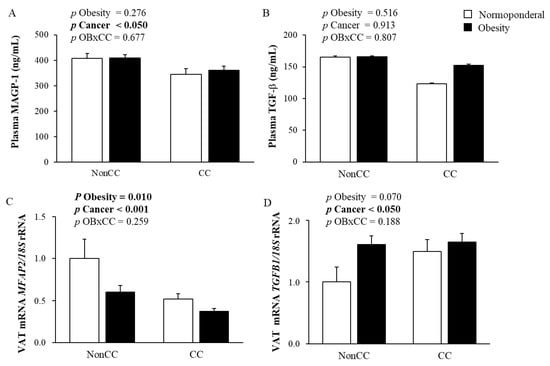MAGP-1 (A) and TGF-β (B) circulating levels in normoponderal (NP) volunteers and patients with obesity (OB) with and without colon cancer (CC). MFAP2 (C) and TGFB1 (D) gene expression levels in NP volunteers and patients with OB with and without CC. Differences between groups adjusted for age were analyzed by two-way ANCOVA. Bars represent the mean ± SEM.