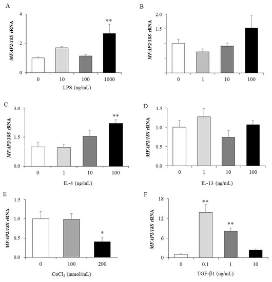 MFAP2 gene expression levels in HT-29 cells treated with different concentrations of LPS (A), TNF-α (B), IL-4 (C), IL-13, (D), CoCl2 (E) and TGF-β (F). Gene expression levels in unstimulated cells were assumed to be 1. Values are the mean ± SEM (n = 6 per group). Differences between groups were analysed by one-way ANOVA followed by Dunnett’s post-hoc tests. * p < 0.05, ** p < 0.01 vs. unstimulated cells.