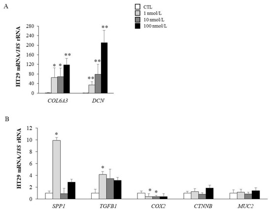Gene expression levels of extracellular matrix remodelling markers (A) as well as tumorigenesis-related molecules (B) in HT-29 cells stimulated with different concentrations of recombinant MAGP-1 for 24 h. Gene expression levels in unstimulated cells were assumed to be 1. Values are the mean ± SEM (n = 6 per group). Differences between groups were analyzed by one-way ANOVA followed by Dunnett’s post-hoc tests. * p < 0.05 and ** p < 0.01 vs. unstimulated cells.