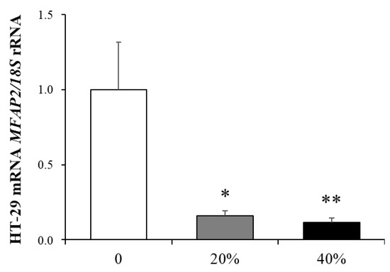 Bar graphs show the effect of ACM (20% and 40%) from obese subjects on the transcript levels of MFAP2 in HT-29 cells. Values are the mean ± SEM (n = 6 per group). Differences between groups were analyzed by one-way ANOVA. * p < 0.05 and ** p < 0.01 vs. unstimulated cells.