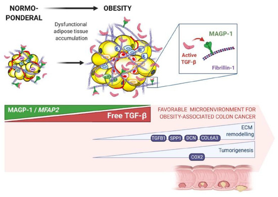 Proposed mechanism of the involvement of MAGP-1 in obesity-associated CC development. Decreased MFAP2 gene expression levels in the visceral adipose tissue from patients with obesity and colon cancer may be responsible for the increased free active TGF-β enhancing its downstream signalling pathways associated with inflammation, ECM remodelling and tumorigenesis. Therefore, MAGP-1 may participate in creating a favourable microenvironment to tumorigenesis in obesity and, thus, function as a link between adipose tissue excess and obesity-associated CC development.