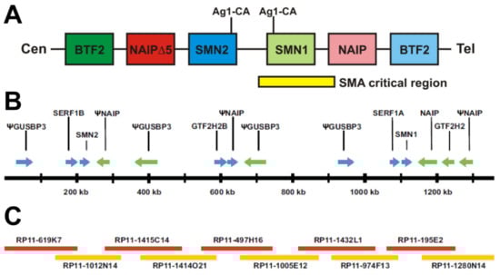Genomic organization of SMN1 and SMN2. (A) Original construction of the SMN region showing inverted duplication. The centromeric end of the chromosome is given on the left and telomeric end on the right. Ag1-CA markers are indicated above with lines to their approximate locations in SMN1 and SMN2, thus suggesting inverted duplication. Further genes in the region, BTF2 and NAIP, are also given, further suggesting inverted duplication. (B,C) Map of the SMA region that was assembled using overlapping clones that originate from the same chromosome. (B) Map of the region showing all genes and their orientation. SMN1 and SMN2 are in the same orientation and are approximately 848 kb away from each other. Lying between SMN1 and SMN2 are 2 NAIP pseudogenes (one containing NAIP exons 6–17 and the other contained NAIP exons 3 and 6–9) and 2 GUSBP3 pseudogenes, as well as SERF1A and GTF2H2B. Pseudogenes are indicated with a (Ψ). (C) Overlapping clones used to construct the region. The smallest overlap between clones was 32,833 bp while the average overlap was 71,850 bp. There was only a single mismatched base pair out of all the overlapping regions.