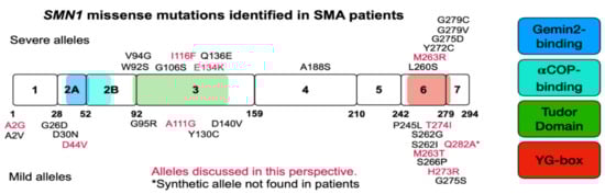 The vast majority of SMA cases result from a large deletion in SMN1; thus patients are entirely reliant on the full-length SMN produced from SMN2 [,]. However, 1% of SMA cases are caused by a loss of function missense mutation in SMN1 [,]. In every instance, missense mutations in SMN1 are always found in the presence of the SMN2 gene. Interestingly, some of these mutations are found in patients who present with milder symptoms than is expected from their SMN2 copy number; thus we refer to those variants as mild SMN missense mutations []. Conversely, there are missense mutations in SMN1 that do not modify the expected SMA phenotype as suggested by the SMN2 copy number [] and these are referred to as severe mutations. Severe SMN missense mutations are predominantly found in the SMN Tudor domain—important for Sm-ring assembly (exon 3)—and the oligomerization domain (exon 6), both highly conserved regions of the SMN protein []. Thus, some severe mutations interfere with dimerization and disrupt SMN function. Missense mutations have been found in every SMN exon except exon 2B and exon 5 (Table 1). A pictorial representation of Table 1 is given in Figure 2.