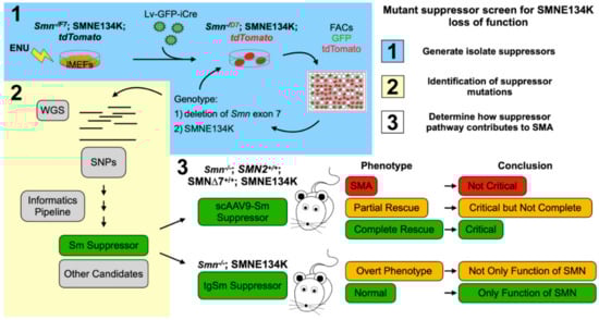 It is possible to identify suppressors of specific SMN missense mutations that inform which function of SMN is critical to SMA. In this regard, we have used the SMNE134K and performed a random mutagenesis screen, using our Smn−/F7 iMEFs to ask whether we can make a mutation that rescues SMNE134K loss of function. This experiment is pictorially represented in Figure 3. In this experiment, Smn−/F7;SMNE134K iMEFs are mutagenized with ENU, then full-length wild-type Smn is removed by transfection with a lentivirus delivering an improved Cre-recombinase (iCre), yielding Smn−/D7;SMNE134K. Thus, there is no functional Smn from the mouse locus and the cells are entirely reliant on the nonfunctional SMNE134K, which causes the cells to die []. However, if a mutation in a gene occurs that can restore the essential function lost by SMNE134K, the cells should live. Indeed, we have performed such a screen and we have identified several mutant suppressor lines which we have sequenced to locate the suppressor. Importantly, the rescue is dependent on having SMNE134K present. If suppression of Smn−/D7;SMNE134K lethality occurs in a specific function of SMN, i.e., Sm-assembly, the suppressor, and SMNE134K can then be introduced into SMA mice or Smn null mice to ask the question, what rescue occurs? Indeed, we know that suppressors in Sm proteins can be obtained. Do Smn null mice expressing SMNE134K, and the suppressor show complete rescue of motor neurons, all phenotypes, or do they still show phenotypic abnormality? If it is complete rescue, then Sm-assembly is the critical function of SMN. If partial rescue occurs, then Sm-assembly contributes to SMA, but other functions must also contribute. Lastly, if a true SMA phenotype results, then there is a new mouse model of SMA and Sm-assembly is not the critical pathway in SMA. Though we have used the SMNE134K missense mutant, this same suppressor screen can be extended to other SMN missense mutations as none rescue survival of the Smn−/D7 iMEFs. These experiments can inform on the specific functional interaction of other members of the SMN complex, other unique SMN complexes, and how they work in an unbiased manner.