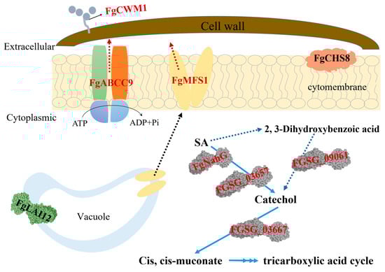 Schematic of the mechanisms on F. graminearum to deal with the toxicity of SA, based on the reported data. Gene names in red and in black indicate the upregulation and downregulation under SA stress, respectively. The red dotted arrows indicate the export of SA. The blue dotted arrows indicate the proposed alternate non-oxidative decarboxylation of SA to catechol via and 2, 3 dihydroxybenzoic acid. The black dotted arrow represents the alternative subcellular localization of FgMFS1 before and after adding SA. FgCWM1 (cell wall mannoprotein 1) is an important component of the outer cell wall and is critical for maintaining the strength of the cell wall. Its expression is up-regulated by SA [21]; FgABCC9 (ATP-binding cassette transporter family C 9) is up-regulated by SA. It is distributed in the cell membrane and cost ATP to export SA [18]; Chitin is a major component of the inner cell wall. FgCHS8 (chitin synthase 8) encodes a chitin synthase (EC 2.4.1.16) that catalyzes polymerization of chitin from UDP-N-acetyl-alpha-D-glucosamine [31,32]. FgCHS8 is an integral membrane protein, and its expression is down-regulated by SA [16]; FgLAI12 (linoleic acid isomerase, EC 5.2.1.5) catalyzes the transformation of linoleic acid to cis-9,trans-11 conjugated linoleic acid. Its expression is down-regulated by SA. FgLAI12 is usually localized in vacuoles even under SA treatment and alternatively expressed in the cell membrane when linoleic acid is added [17]; FgNahG (salicylate hydroxylase, EC 1.14.13.1) catalyzes SA to catechol, which is widely distributed in fungal cells. Its expression is up-regulated by SA [19]; FGSG_03657 (salicylate 1-monooxygenase, EC 1.14.13.1) is up-regulated by SA, which catalyzes SA into catechol [13,20]; FGSG_09061 (2, 3-dihydroxybenzoic acid decarboxylase) is involved in a proposed alternate non-oxidative decarboxylation of SA to catechol via 2, 3 dihydroxybenzoic acid. Its expression is up-regulated by SA [13,20]; FGSG_03667 (catechol 1, 2-dioxygenase) catalyzes catechol into cis, cis-muconate [20]. Its expression is induced by SA.