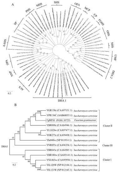 Phylogenetic analysis of MFS transporters. (A) MFS transporters can be classified into 17 families: DHA 1 (drug: H+ antiporter (12-TMS)) drug efflux family, ACS (anion: cation symporter) family, NNP (nitrate–nitrite porter) family, OPA (organophosphate: inorganic phosphate antiporter) family, AAHS (aromatic acid: H+ symporter) family, SP (sugar porter) family, PHS (phosphate: H+ symporter) family, MHS (metabolite: H+ symporter) family, SHS (sialate: H+ symporter) family, OFA (oxalate: formate antiporter) family, MCP (monocarboxylate porter) family, CP (cyanate permease) family, FGHS (fucose–galactose–glucose: H+ symporter) family, OHS (oligosaccharide: H+ symporter) family, NHS (nucleoside: H+ symporte) family, UMF (unknown major facilitator) family, and DHA 2 (drug: H+ antiporter (14-TMS)) drug efflux family. (B) Phylogenetic analysis of the members of DHA1 family. “YGR138c (CAA97151.1) Saccharomyces cerevisiae” represents the protein name, accession number, and Latin name, respectively. The numbers under/above each node are the bootstrap values.