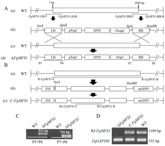 The gene sequence of FgMFS1 was removed from the WT strain by homologous recombination (Figure 4A) to create the deletion mutants (ΔFgMFS1). PCR was used to screen the ΔFgMFS1 mutants to make sure that the construct had been recombined into the intended homologous site (Figure 4C). The ORF of FgMFS1 was randomly inserted into the genome of ΔFgMFS1 to create the complementation mutants (C-FgMFS1; Figure 4B). Reverse transcription (RT)-PCR showed that FgMFS1 was normally transcribed in C-FgMFS1 as in the WT strain, and no expression was detected in ΔFgMFS1 as expected (Figure 4D).