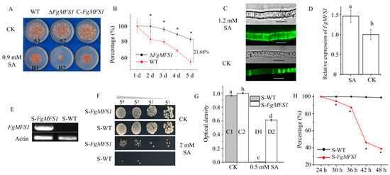 2.3. FgMFS1 Is Important for Fungal Response to SA