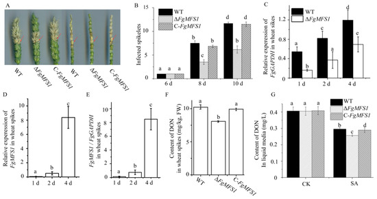 The spikes point inoculated with ΔFgMFS1 showed fewer visual FHB disease symptoms (Figure 6A,B) and less fungal biomass (Figure 6C) compared to those point inoculated with WT and C-FgMFS1 on the 6th, 8th, and 10th dpi. The expression of FgMFS1 was significantly increased during infection (Figure 6D,E).