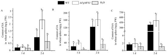 SA, jasmonic acid (JA), and indole acetic acid (IAA) participate in wheat resistance against F. graminearum [14,33]. To understand whether FgMFS1 affects the accumulation of these hormones, we compared the contents of SA, JA, and IAA in spikes inoculated with water (CK treatment), WT, and ΔFgMFS1, respectively (Figure 7). On the 1st dpi, the contents of SA, JA, and IAA were higher in spikes inoculated with WT and ΔFgMFS1 than those under CK treatment, although most comparisons were insignificant. Inconsistent with the fungal biomass data in Figure 6C, spikes inoculated with ΔFgMFS1 accumulated more SA, JA, and IAA than those inoculated with WT strain. On the 2nd dpi, the contents of these hormones showed similar changes to the 1st dpi.