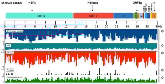 Bioinformatic analysis with the ScanFold server provided an informative overview regarding the highly predicted stable regions of SARS-CoV-2 RNA. Specifically, the analyses led to the identification of 300 nt sequences bearing negative z-scores, which were predicted to possess low MFE native values, thus, being more stable. Sequences with notable negative z-scores were found to distribute across the SARS-CoV-2 genome (Figure 1).