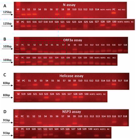 Agarose-gel electrophoresis of the PCR products of our nested PCR assays: (A) N assay; (B) ORF3a assay; (C) helicase assay; (D) NSP3 assay, in 30 wastewater samples (S1–S30). M, 50 bp DNA ladder; PC, positive control; NC, PCR negative control; NCRT, reverse transcription negative control.