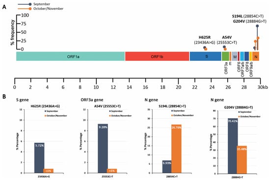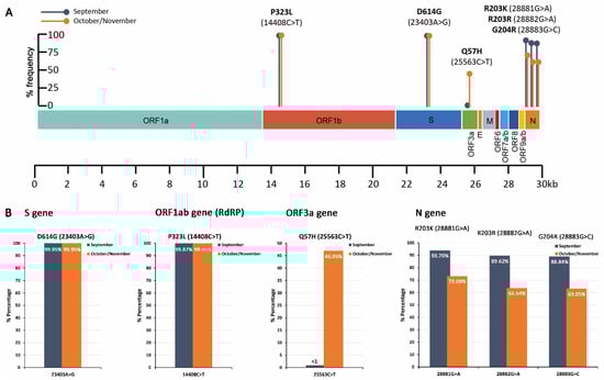 The analysis highlighted that the G614 strain of SARS-CoV-2, originating from the D614G (23403A>G) point mutation in S gene, was exclusively detected (>99.9%) over the D614 strain. This finding is in line with the genomic data of the GISAID (https://www.gisaid.org/ accessed on 1 May 2021) and Nexstrain (https://nextstrain.org/sars-cov-2 accessed on 1 May 2021) databases, highlighting the significant prevalence of the G164 strain in percentage of >98% and ~100% worldwide and in Europe, respectively. Similarly, the P323L (14408C>T) substitution in the ORF1ab/RdPR gene was also prevalent, ~99.9%, in both time periods of sampling, also in agreement with the genomic epidemiology data (~99% worldwide and in Europe). Interestingly, the Q57H (25563G>T) mutation in the ORF3a gene was solely found observed in October/November samples at a percentage of ~47%, which is in accordance with the growing trend observed worldwide during the last months (11/2020, ~43%).