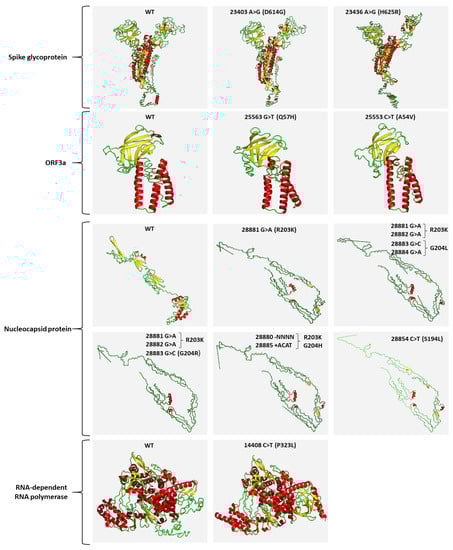 Predicted 3D structure models of “wild-type” and mutated SARS-CoV-2 proteins, using the I-TASSER v.5.1 server. For each protein, only the 3D structure with the highest confidence score is shown. Helix, sheet, and loop structures for each protein are depicted with red, yellow, and green colors, respectively.