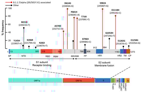 Schematic illustration of % frequency of missense mutations across the entire S gene colored by domain. Domains that are not visualized in the final map are colored grey. Numbers indicate amino acid residues. Β.1.1.7/alpha (20I/501Y.V1) associated missense mutations are indicated by red. SP, signal peptide; NTD, N-terminal domain; RBD, receptor-binding domain; RBM, receptor-binding motif; FP, fusion peptide; HR1, heptad repeat 1; HR2, heptad repeat 2; TM, trans transmembrane domain; CP, cytoplasmic peptide.