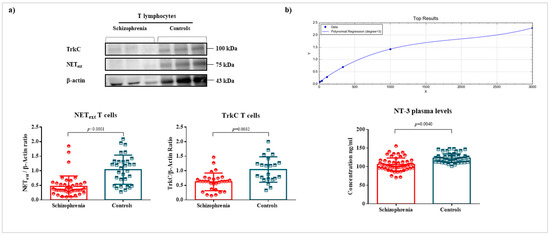 Levels of NET and TrkC in T cells, and NT-3 in plasma. Legend: quantification of NET and TrkC levels in T cells and NT-3 in plasma, and their respective scatter plots and bar graphs (mean ± SD). (a) NEText (45 patients with schizophrenia vs. 31 controls) and TrkC (31 patients with schizophrenia vs. 22 controls) levels were measured by Western blot and normalized with the housekeeping protein β-actin. Relative units refer to the mean of control values after normalization. The results showed a reduction in NET levels (p < 0.0001) and TrkC levels (p = 0.0032) in T cells of patients with schizophrenia compared to the control group. (b) The analysis of NT-3 (54 patients with schizophrenia and 54 healthy controls) in plasma revealed a reduction in this neurotrophin in the plasma of patients in comparison with controls (p = 0.0040), whose concentration was measured by ELISA using a polynomial regression method (Y = absorbance; X = concentration, degree = 3; R2 = 0.9999).