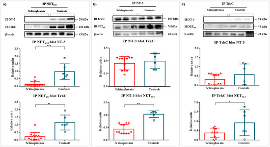 Co-immunoprecipitations (Co-IPs) were performed for analyzing protein–protein interactions between NEText, NT-3, and TrkC. Hence, immunocomplexes were analyzed by Western blot: Co-IP NEText-blot NT-3 (0.0672 ± 0.33 vs. 1.000 ± 026, p = 0.0003); and Co-IP NEText-blot TrkC (0.2286 ± 0.08 vs. 1.000 ± 0.23, p = 0.0020). The conformation of immunocomplexes in T cells was confirmed in the control group, but not in the group of patients with schizophrenia (Figure 2). Equally, the reverse Co-IPs were also performed and confirmed the interaction of NT-3–NEText (0.4257 ± 0.09 vs. 1.000 ± 0.08, p = 0.0021) and TrkC–NEText (0.3785 ± 0.10 vs.1.000 ± 0.25, p = 0.030) in the T cells of controls (Figure 2). To summarize, immunocomplexes reached statistical relevance in the control group (Figure 2). No statistical significance was found for NT-3 and TrkC Co-Ips and reverse Co-IPs in both groups (p > 0.05) (Figure 2).