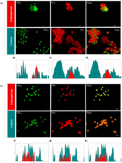 Fluorescence microscopy images of T cells, double-labelled for NEText and NT-3 or NEText and TrkC, were studied. To support the idea of immunocomplex and protein interactions, immunofluorescence staining was performed for corroborating the presence of these proteins in T cells and in the extracellular space. TrkC and NEText appeared in the plasma membrane, whereas NT-3 had an extracellular distribution. T cells of patients with schizophrenia (n = 5) stained with NEText–NT-3 showed a restricted distribution of NEText and NT-3 compared with the controls (n = 5) (Figure 3a). In the same sense, the distribution of TrkC (NEText–TrkC staining) was restricted in T cells of patients with schizophrenia (Figure 3e). Intensity profile graphs revealed a distinctive distribution of proteins in patients with schizophrenia (red) and controls (green), confirming the results obtained by Co-IPs.