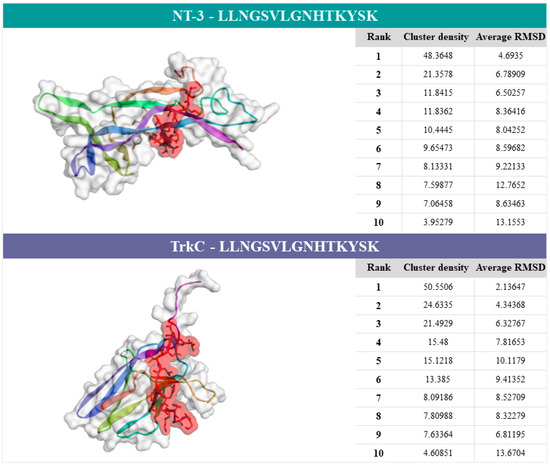 After finishing the job, the CABS-dock server provided a results webpage with the docking construct. Ten individual predictive models based on NT-3 protein (PBD code: 1nt3:A) or TrkC protein (PBD code: 1wwc:A), and CCCCCEECCCCCCCC peptide secondary structure were shown (Figure S1). The first model was the most important prediction considering the docking calculations. The cluster density (average difference between cluster elements and the number of elements) was 48.3648 and the average RMSD was 4.6935 Å for NT-3, whereas, for TrkC, the cluster density was 50.5506 and the average RMSD was 2.13647 Å (Figure 4).