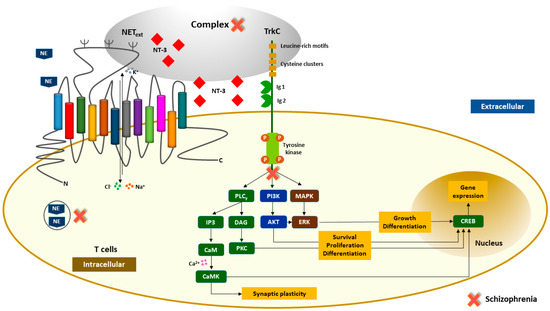 Schematic representation of NEText, NT-3, and TrkC distribution in T cells of patients with schizophrenia and healthy controls. Legend: NT-3-mediated signal transduction pathways through dimerization of TrkC receptors, which results in an intracellular activation of extracellular signal-regulated kinases (ERKs), phosphatidylinositol-3-kinase (PI3K)-protein kinase B (AKT), and phospholipase C-γ (PLCγ) pathways promoting cell survival, proliferation, differentiation, synaptic plasticity, and gene expression in T cells. The molecular complex between the second extracellular loop of NEText (corresponding to amino acid residues 189–204) and NT-3 or TrkC seems to be essential for appropriate activation of the signaling cascade in a peripheric context that involves immune system cells. The red cross represents the mechanisms/pathways that are disrupted in schizophrenia.