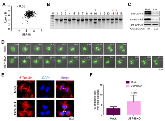 USP48 influences cell cycle progression. (A) A scatterplot demonstrating the correlation between USP48 and Aurora B mRNA levels was plotted. Pearson correlation analysis (r) was used to quantify the relationship between USP48 and Aurora B (n = 455). (B) Single-cell-derived USP48KO colonies were screened using the T7E1 assay. Red asterisk represents the T7E1 positive USP48KO clones, i.e., USP48KO clones #3, #10, #14, and #15. (C) The effect of USP48 knockout on Aurora B protein expression was checked by Western blot analysis in USP48KO clone #10 upon M phase synchronization with 100 ng/mL Nocodazole for 18 h. GAPDH was used as a loading control. (D) Time-lapse microscopy of mock and USP48KO HeLa cells transfected with GFP-H2B and treated with thymidine and released into fresh medium to track cells undergoing mitosis. Time points are indicated in hh:mm format. Scale bar = 10 μM. (E) Microtubules were stained with β-Tubulin-Cy3 antibodies in mock and USP48KO HeLa cells. DAPI was used to stain the nuclei. Scale bar = 10 μM. (F) Graph representing the percentage of multinucleated cells in mock (3.166 ± 0.98), and USP48KO HeLa cells (6.667 ± 3.20) (n = 3, p = 0.028).