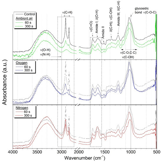 Attenuated Total Reflectance-Fourier Transform Infrared spectroscopy (ATR-FTIR) spectra of maize grains untreated and after plasma treatment in ambient air, oxygen and nitrogen, treatment time 60 s, 300 s, at input power 400 W.