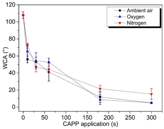 Effect of plasma exposure time on the water contact angle (WCA) measured on maize grains, samples treated by ambient air, oxygen, and nitrogen Diffuse Coplanar Surface Barrier Discharge (DCSBD) plasma at atmospheric pressure, the input power was 400 W. Values are the mean ± SD, n = 10.