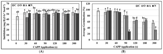 Imbibition (A) and germination (B) (%) of maize grains after Cold Atmospheric Pressure Plasma (CAPP) treatment. Variants: C—control/untreated maize grains; O30–O300: maize grains treated with plasma generated in an oxygen atmosphere for 30, 60, 90, 120, 180 or 300 s; A30–A300: maize grains treated with plasma generated in ambient air for 30, 60, 90, 120, 180 or 300 s; N30–N300: maize grains treated with plasma generated in a nitrogen atmosphere for 30, 60, 90, 120, 180 or 300 s. Different letters indicate significant difference at p-value < 0.05, bars are means of ten experimental runs (one run represents 50 grains per variant, n = 500) ± SD to LSD ANOVA test.