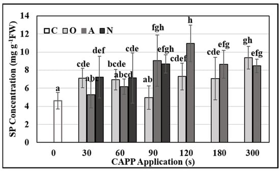 Total soluble protein (SP) concentration in 3-day-old maize seedlings after Cold Atmospheric Pressure Plasma (CAPP) treatment of grains. Variants: C—control/untreated maize grains; O30–O300: maize grains treated with plasma generated in an oxygen atmosphere for 30, 60, 90, 120, 180 or 300 s; A30–A300: maize grains treated with plasma generated in ambient air for 30, 60, 90, 120, 180 or 300 s; N30‒N300: maize grains treated with plasma generated in a nitrogen atmosphere for 30, 60, 90, 120, 180 or 300 s. In the case of N120–300 variants, the maize grains did not germinate, so they are not shown in the graph. Different letters indicate significant difference at p-value < 0.05, bars are means of ten experimental runs (one run represents 50 grains per variant; three 1.5 g mixed samples were analyzed per one experimental run and each variant for soluble protein concentration) ± SD according to LSD ANOVA test.