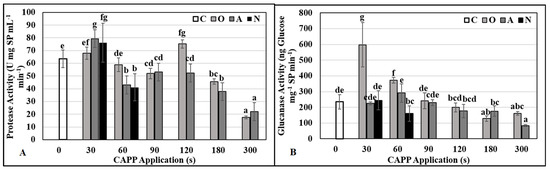 The activity of protease (A) and glucanase (B) in 3-day-old maize seedlings after Cold Atmospheric Pressure Plasma (CAPP) treatment of grains. Variants: C–control/untreated maize grains; O30–O300: maize grains treated with plasma generated in an oxygen atmosphere for 30, 60, 90, 120, 180 or 300 s; A30‒A300: maize grains treated with plasma generated in ambient air for 30, 60, 90, 120, 180 or 300 s; N30–N300: maize grains treated with plasma generated in a nitrogen atmosphere for 30, 60, 90, 120, 180 or 300 s. In the case of N90 variant seedlings lagged significantly in development and in N120–300 variants, the maize grains did not germinate, so they are not shown in the graph. Different letters indicate significant difference at p-value < 0.05, bars are means of ten experimental runs (one run represents 50 grains per variant; three 1.5 g mixed samples were analyzed per one experimental run and each variant for protease and glucanase activities) ± SD according to LSD ANOVA test.