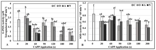 After evaluating the activity of antioxidant enzymes, we can state that CAPP treatment did not increase oxidative stress in three-day-old maize seedlings. The activities of SOD in the treated variants were comparable to the untreated control (Figure 6B); the activity of G-POX (Figure 6A) increased slightly only in the variant O30.