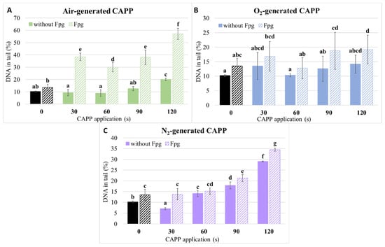 Level of DNA damage in 3-day-old maize seedlings detected by the neutral comet assay and its modification with enzyme formamidopyrimidine glycosylase (Fpg) after the treatment of maize grains with Cold Atmospheric Pressure Plasma (CAPP) generated in ambient air (A), oxygen (B) or nitrogen (C). 0 s—negative control (NC; no treatment); 30, 60, 90 and 120 s—treatment of grains with CAPP for 30–120 s; at least 100 nuclei were analyzed per slide. The data were analyzed using the statistical method LSD ANOVA and comparisons between the mean values were considered significant at p 0.05. Different letters indicate significant difference at p-value < 0.05, bars are the means of three experimental runs ± SD.
