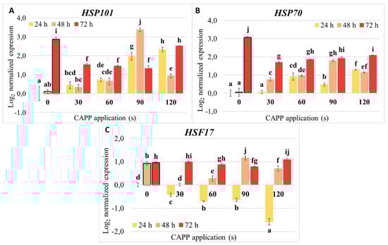The relative expression of HSP101 (A), HSP70 (B) and HSF17 (C) in maize seedlings, which were treated with Cold Atmospheric Pressure Plasma (CAPP) generated in ambient air as grains for 0, 30, 60, 90 and 120 s, detected at 24, 48 and 72 h after sowing. Data are normalized to reference genes—tubulin β and elongation factor EF1α. The data were analyzed using the statistical method LSD ANOVA and comparisons between the mean values were considered significant at p 0.05. Different letters indicate significant differences between the treatments at p-value < 0.05 level.