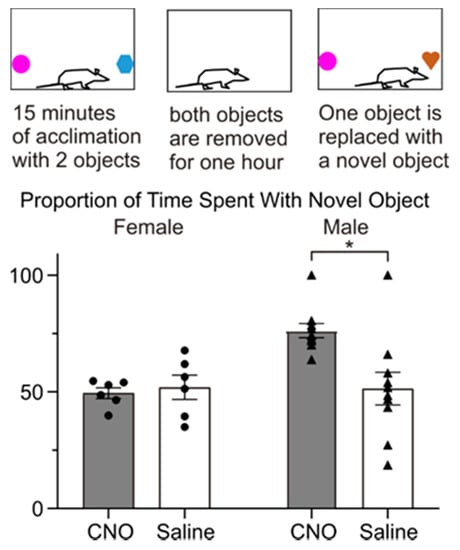Male rats spent more time interacting with a novel subject than female rats. A graphic representation of the novel object paradigm is shown (top). Animals received an injection of Clozapine-N-Oxide (CNO) or saline 1 h prior to acclimation. Two randomly selected objects were placed within the cage and the animal was allowed to interact with both objects for 15 min. Both objects were removed for one hour, and then one of the former objects, along with one novel object was placed in the cage for 15 min. Histogram (bottom) shows the proportion of time interacting with a novel object (filled bars are with CNO treatment, open bars were with saline injection). While activation of DREADDs expressing PVN OXT neurons with CNO had no effect in females, activation of PVN OXT neurons significantly increased the proportion of time spent with the novel object in males. * p < 0.05.