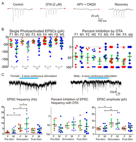 In response to a single 5 s duration photoexcitation of a spontaneous blue light, the frequency and amplitude of EPSCs significantly increased in LC NA neurons, Figure 3C (from 1.6 ± 0.3 Hz to 5.5 ± 0.9 Hz (females, n = 7, p = 0.004, F = 7.438), and 3.4 ± 0.7 Hz to 12 ± 2 Hz (males, n = 12, p = 0.0037, F = 6.923). The EPSC amplitude (D3) was enhanced from pre-stimulation of 17 ± 1.4 pA to 33 ± 5 pA (females, n = 7, p = 0.0027, F = 10.07), and 19 ± 3 pA to 32 ± 5 pA (males, n = 12, p = 0.0001, F = 16.45)). Furthermore, the increase in EPSC frequency was significantly greater in males than females (Figure 3C). However, OTA inhibited EPSC frequency similarly in males and females, and the increase in EPSC amplitude was similar in males and females (Figure 3C).